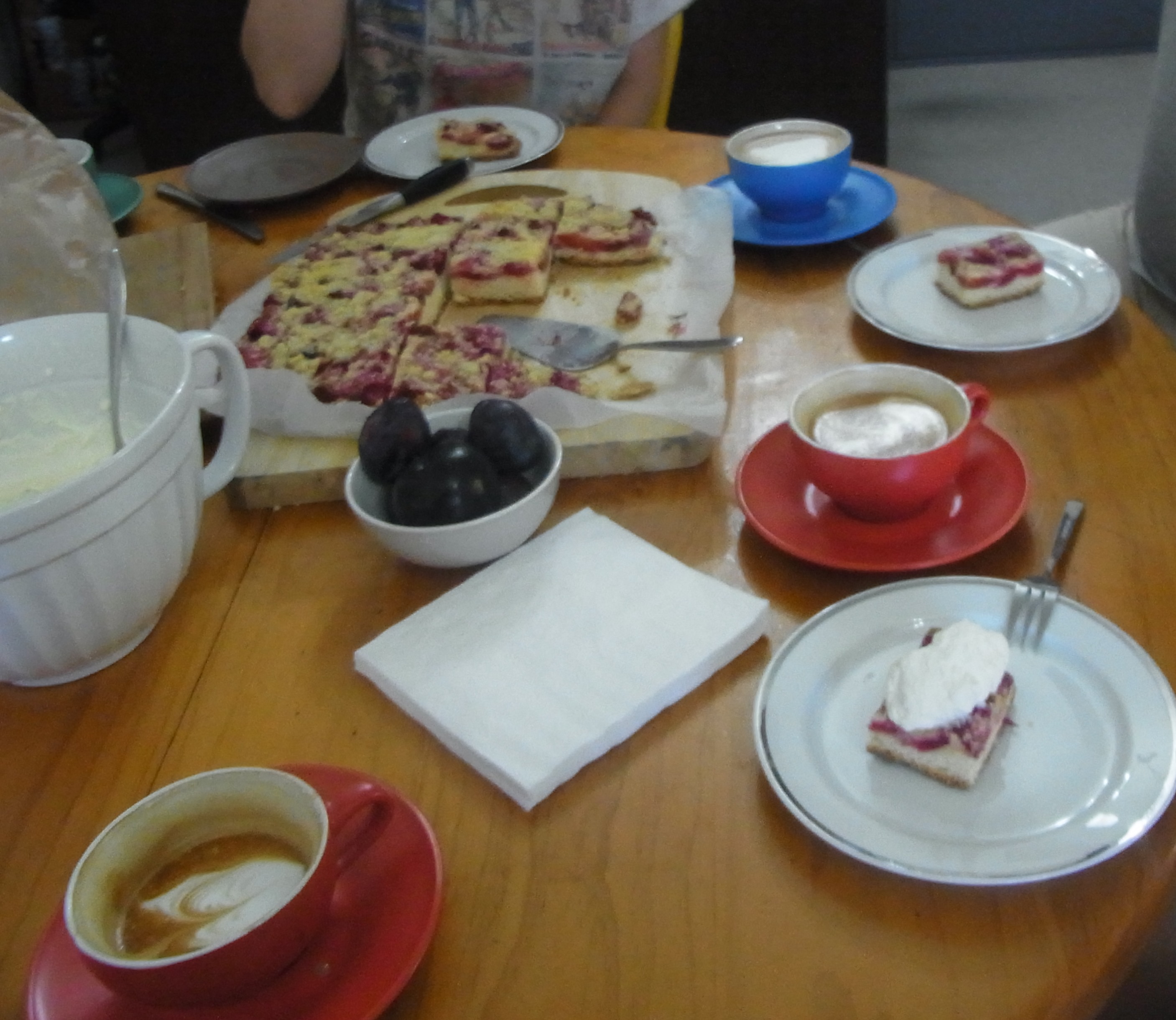 The yeast cake that daughter Caroline had baked for our visit, was very good. She had put fresh plums and crumbles on top and served it with beautiful fresh whipped cream. She baked such a big tray full. Lots was left over and so she packed up a few pieces for us to take home, which we did eat pretty quickly. It was so good! Yummy, yummy. Not so good for our intentions of not putting on extra weight, though! Matthew made us lovely cups of coffee to go with the cake.
