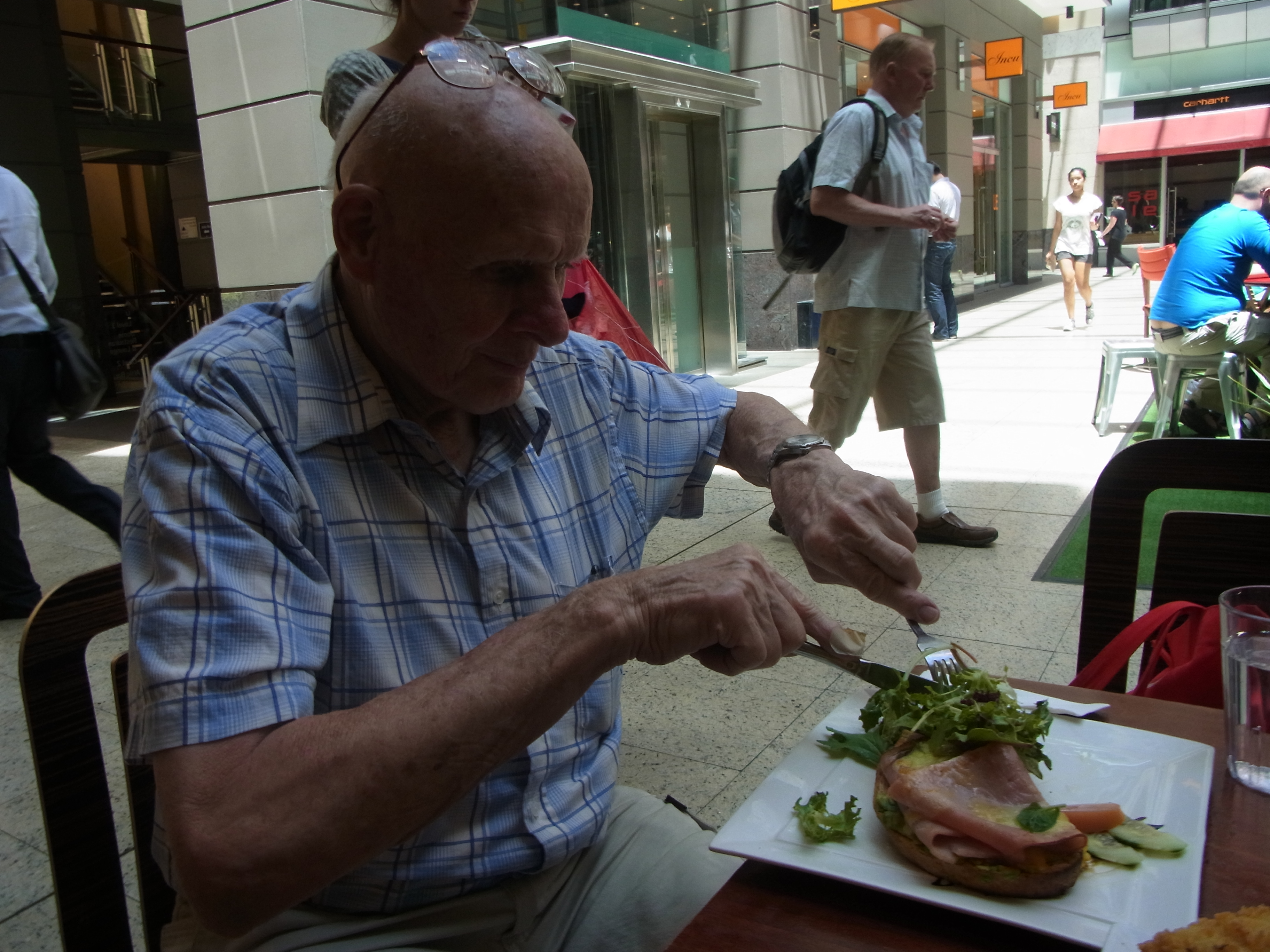 I want to publish again what we did on the last day of 2012! Our day started with a trip to Bondi Junction, where we met our daughter. We had a cup of coffee with Caroline. Then Caroline had to go shopping. We strolled back to the station. This time to a different entrance of the station, one that we weren’t familiar with yet. A beautiful large rest asrea opened up in front of us. Lots of different food and drinks were on offer at different outlets. In the middle of the plaza some delicious looking (homemade) ice-cream caught our eye. Peter and I each had a cup full of this very refreshing treat. It wasn’t expensive but tasted wonderful. There were plenty of seats everywhere to have a rest. We took the lift down to the platform. Only a few minutes and our train departed. We got off at Town Hall Station. We had a lovely lunch near Town Hall Station. I had ordered Fish and Chips. The fish was delicious! Peter had ordered something with meat.