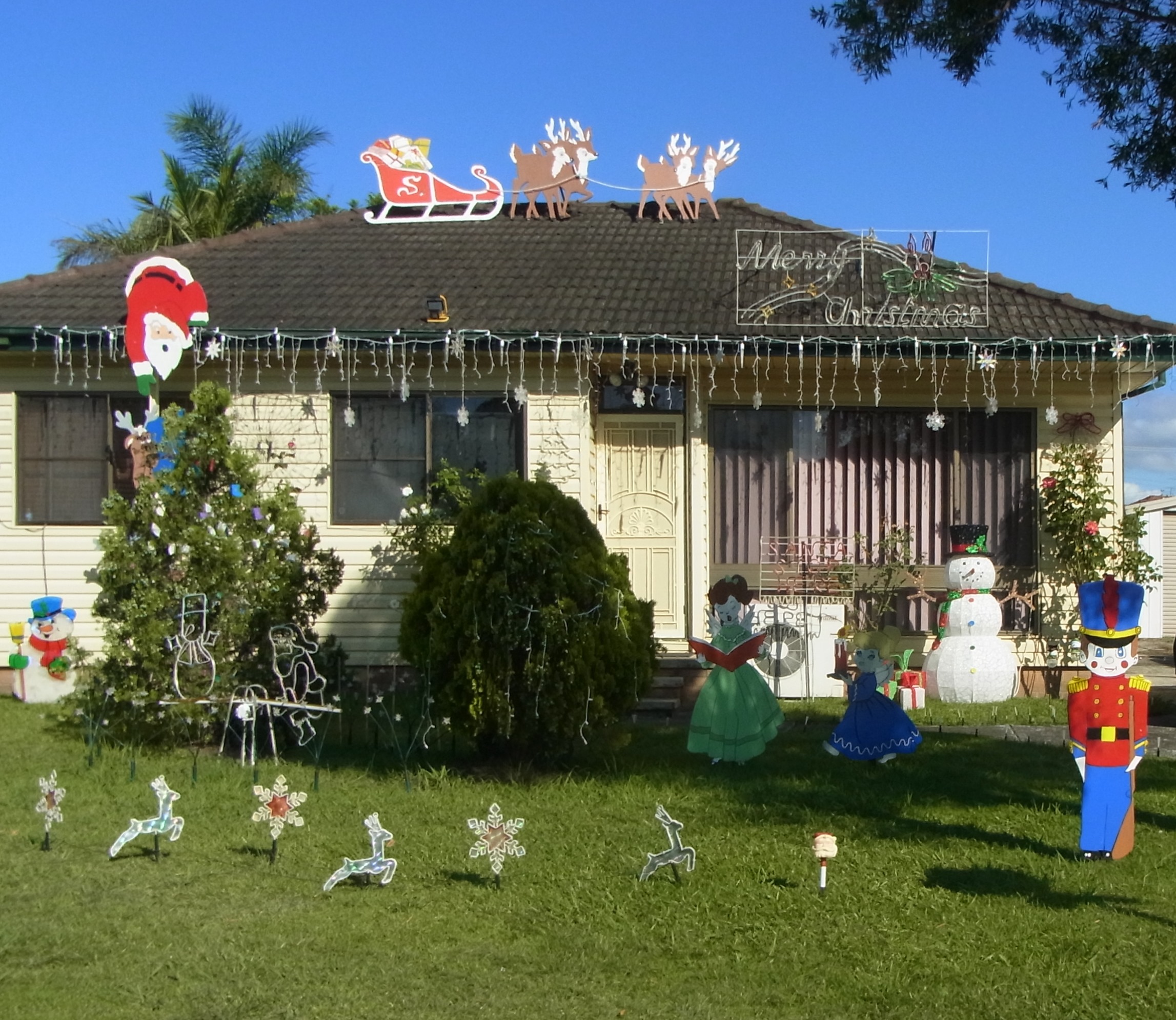 This was yesterday when we put up the tree. Today is Tuesday, the 17th of December 2013. I went for an early morning walk past Brooks Creek and then along Cambridge Road. Bear with me, I took some more flower pictures! And then I discovered a house decorated with lights and a lot of Christmas themes. I hope we can take a little walk tonight and have a look at this house when they put the Christmas lights on!