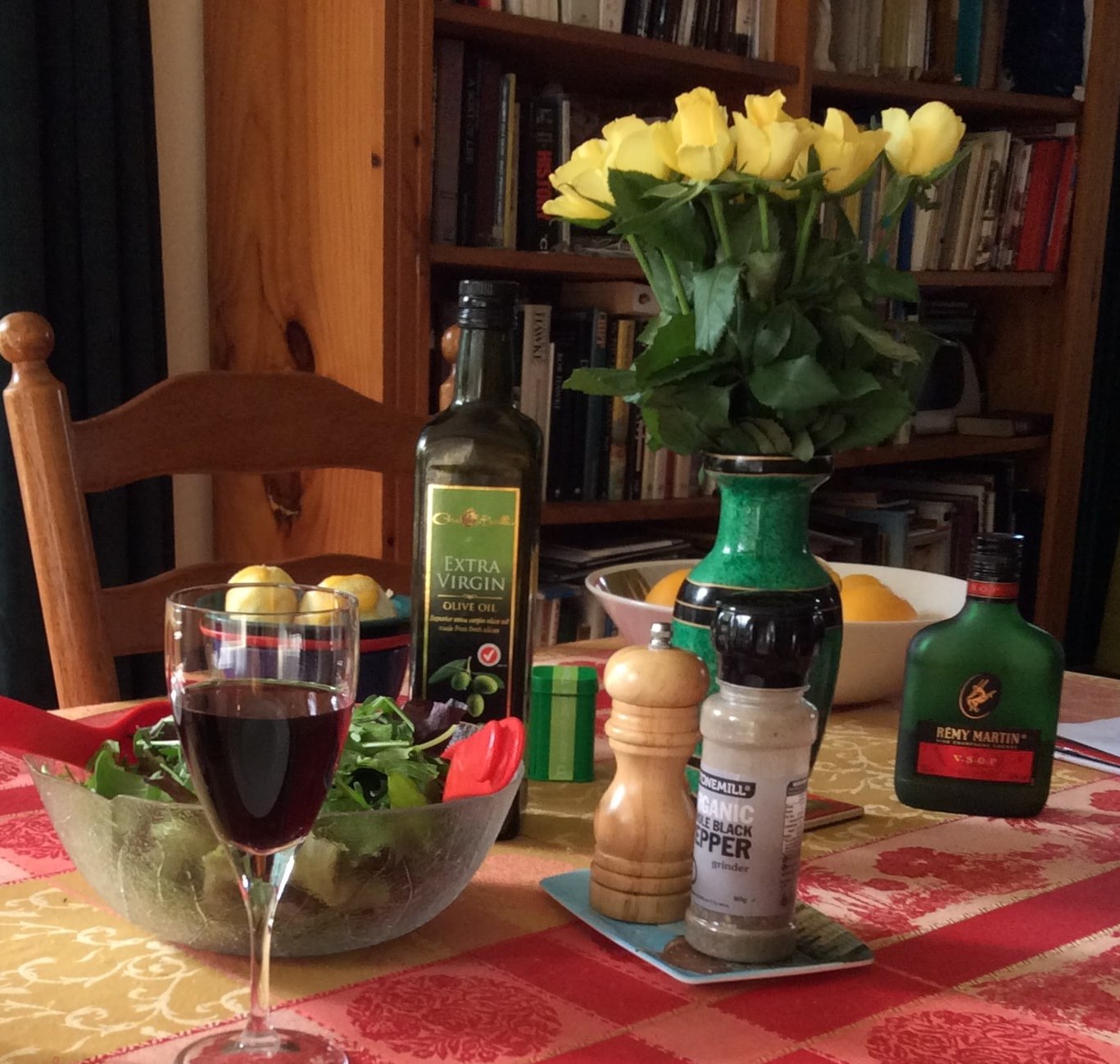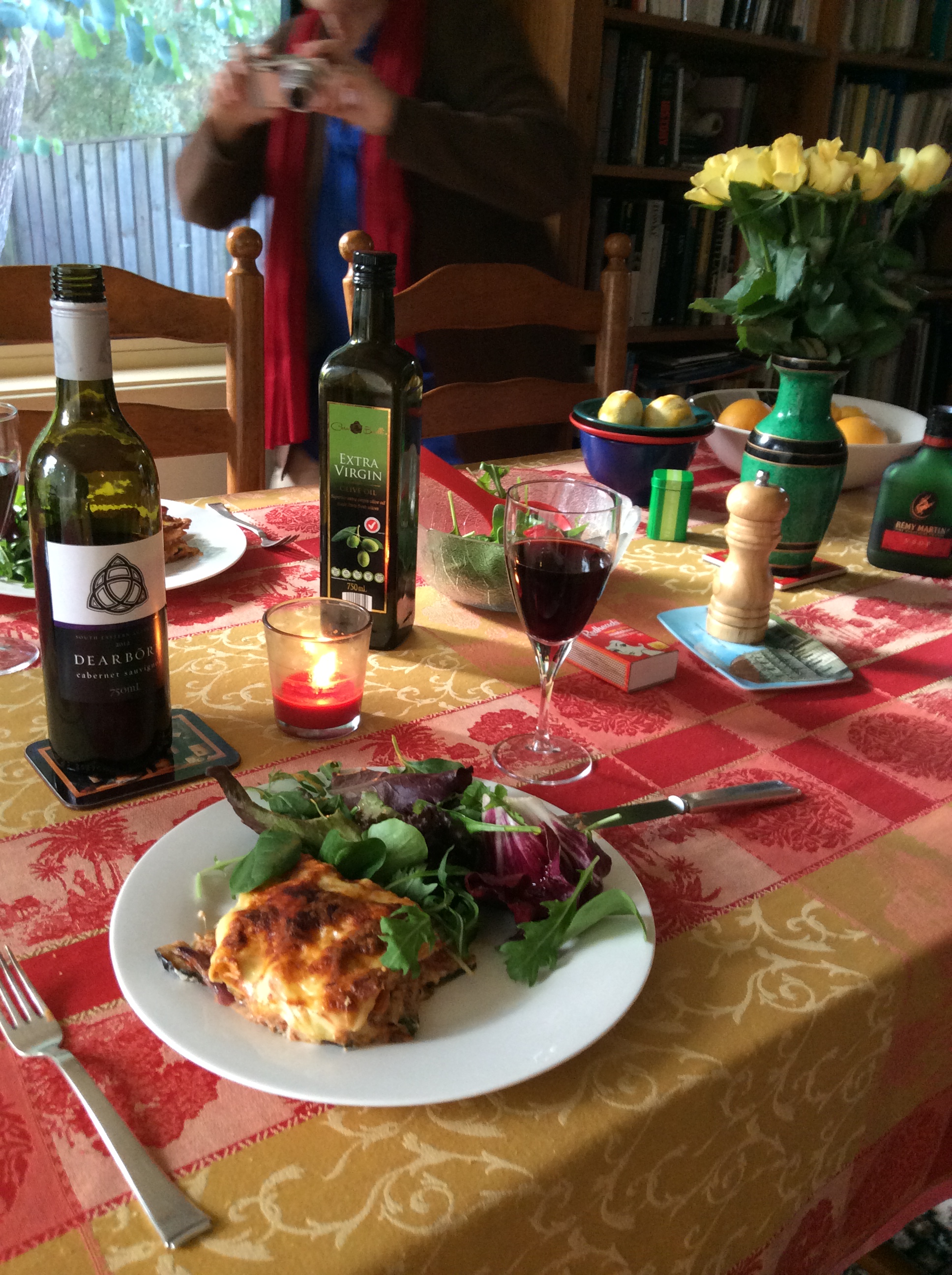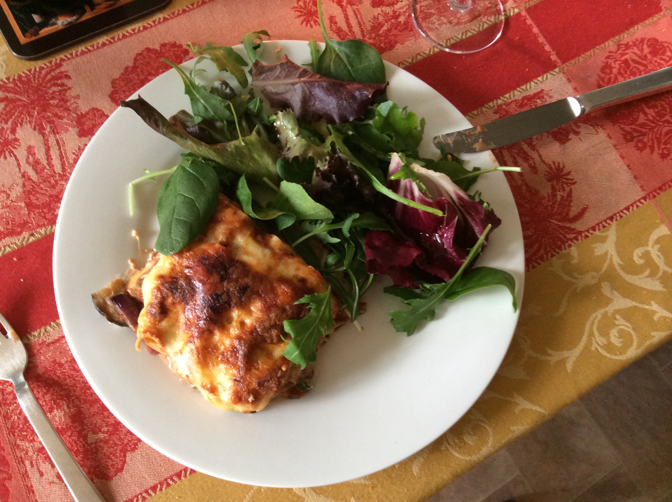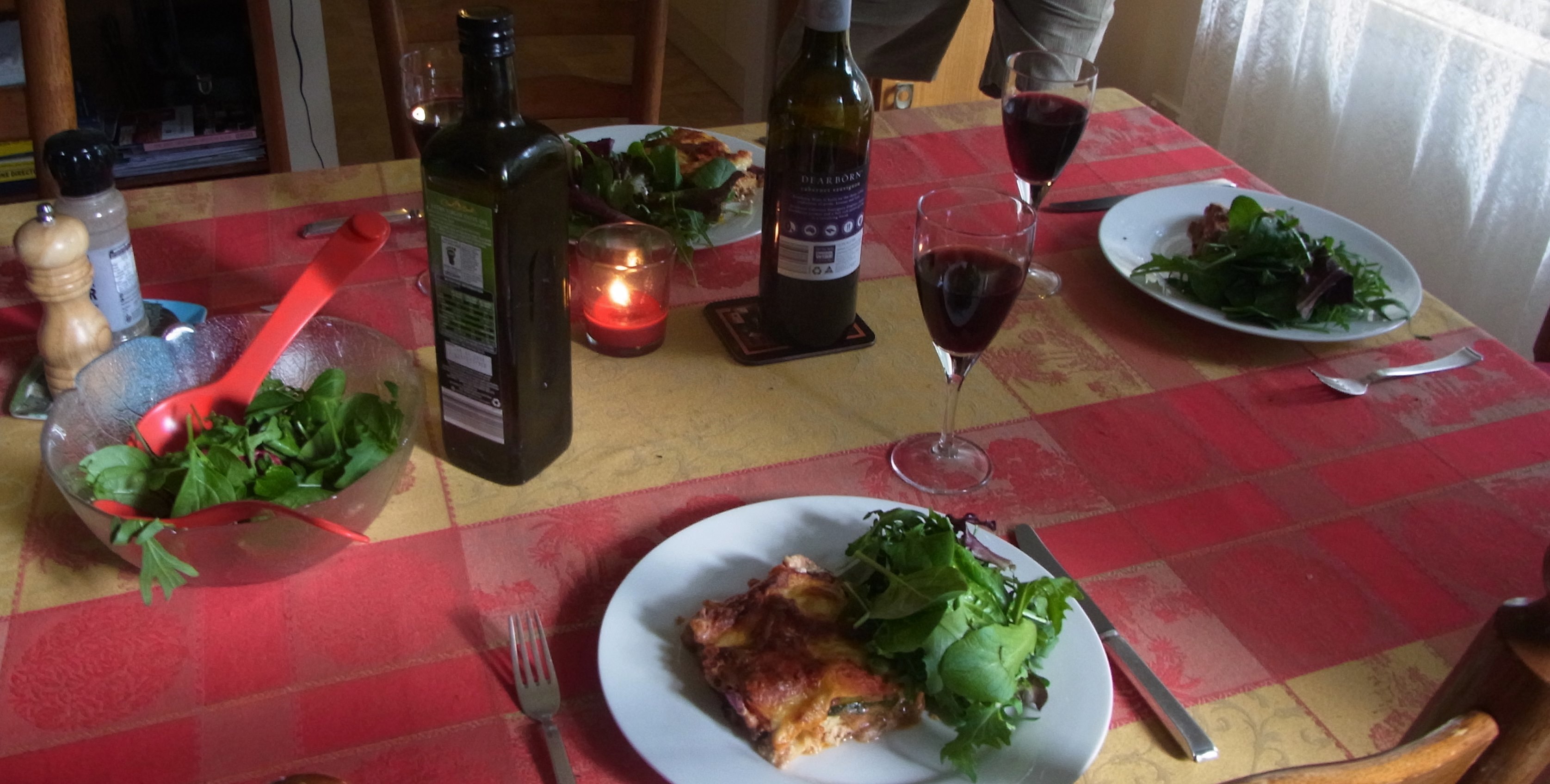 We are back home. The table is set. Now we are going to have lasagne with some salad and a glass of red wine.