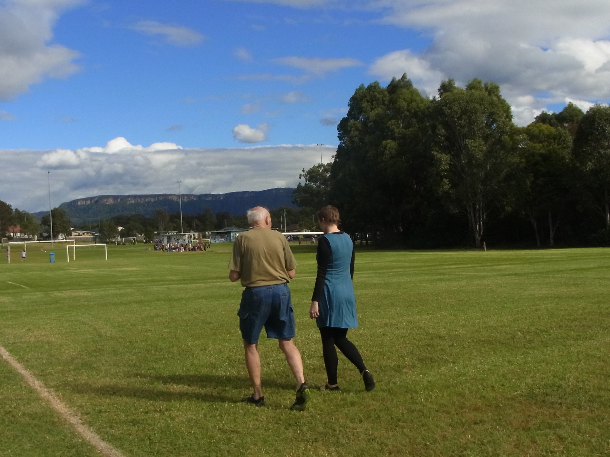 We walk on the grass towards the soccer fields.I follow Peter and Caroline.