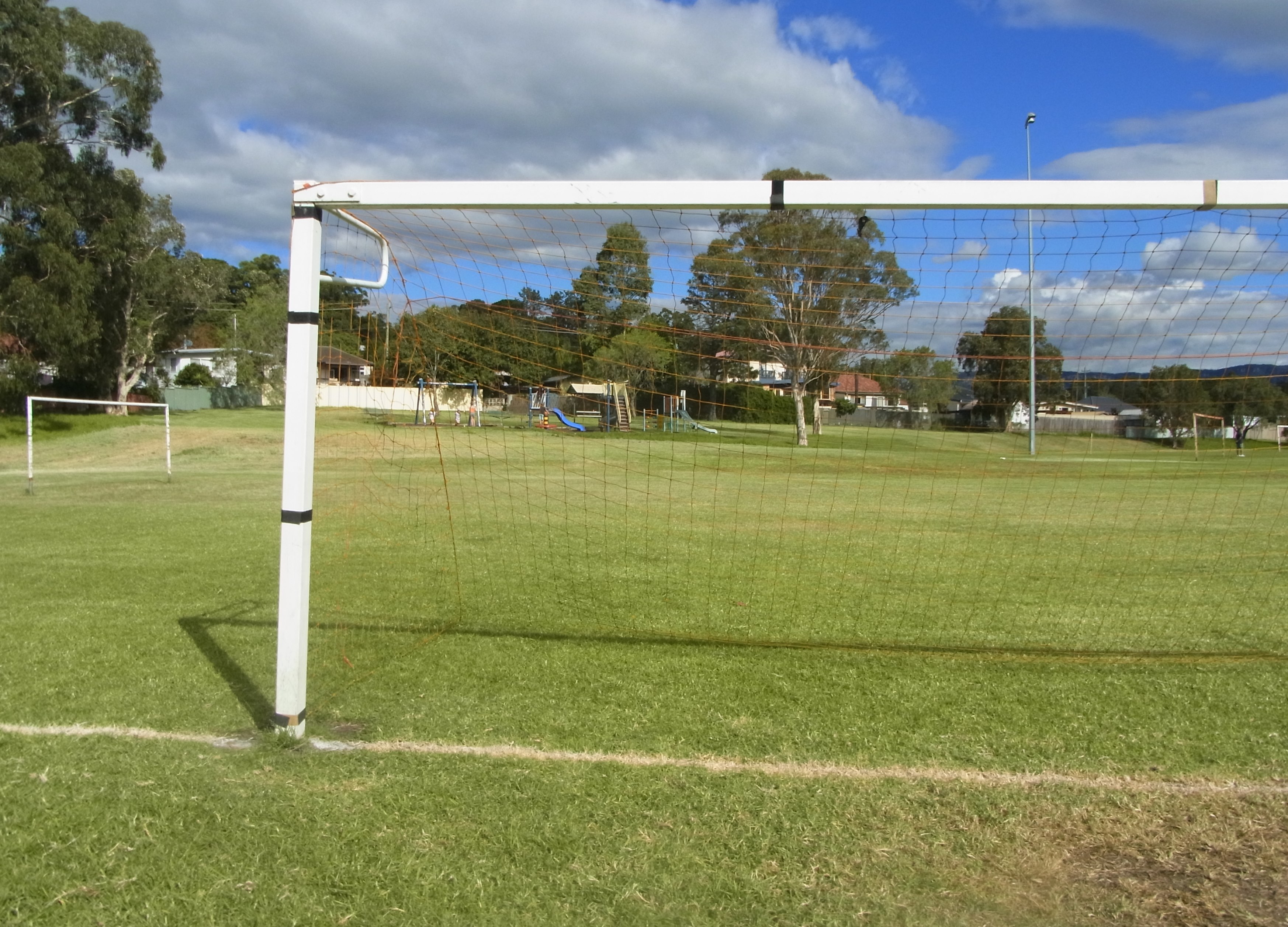 This photo was taken around Christmas 2OOO. Krystal wonders what Granddad is going to do with these sunflowers that grew in his garden.This is just a bit of the front of our house in the year 2000. I put this photo in to show how small this tree in front of our window was at the time. It looks very huge now, and the gardener trims it every so often, otherwise there would not be left enough room for one of the parking spots at the left of the house.This picture is probably from around 2000. This is what it looks like on a day when some kids play soccer at Lakelands Park. Kids still play soccer there during the winter season.This is in Lakelands Park in 2001 when Ilse was with us again.Krystal sits between Monika and me.Krystal has been sliding down and Roxy stand beside her.