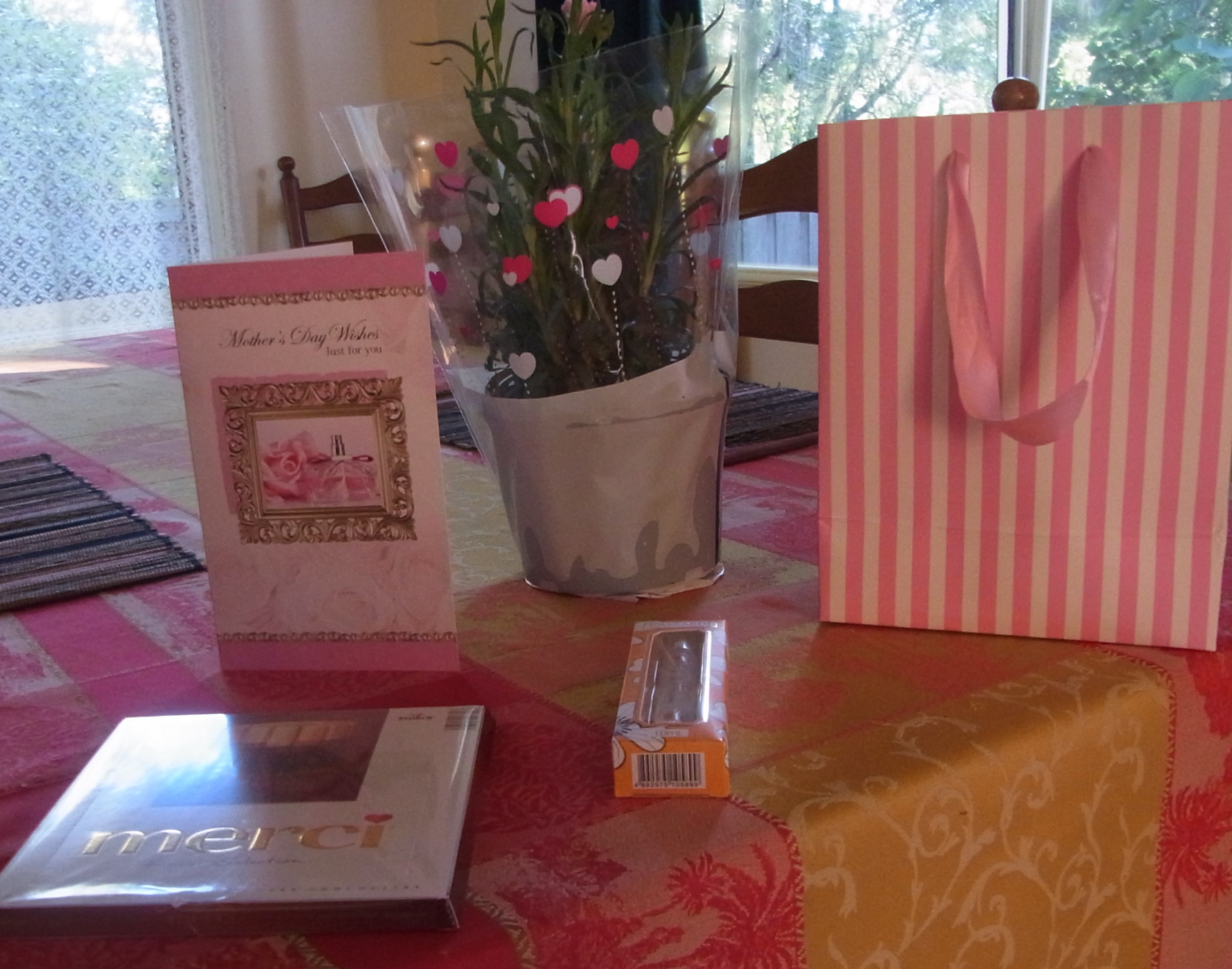 We all had plenty to eat for lunch. I always love rice and vegetables with a spicy Thai sauce and Chinese tea. As entree we all had some spring-rolls. For afternoon coffee and cake the family came to our place. I liked all this very much. My daughters gave me some beautiful gifts for my skin and for smelling nice! My son rang me from Melbourne later on in the evening. For afternoon coffee one son-in-law did bring along his mother as well as the mother of his deceased wife. The conversation around the table was quite animated. The other son-in-law arrived a bit later from Sydney after he had seen his mother. Ebony, the mother of Lucas, went after lunch with Baby Lucas to see her mother and therefore did not come to our place for coffee.