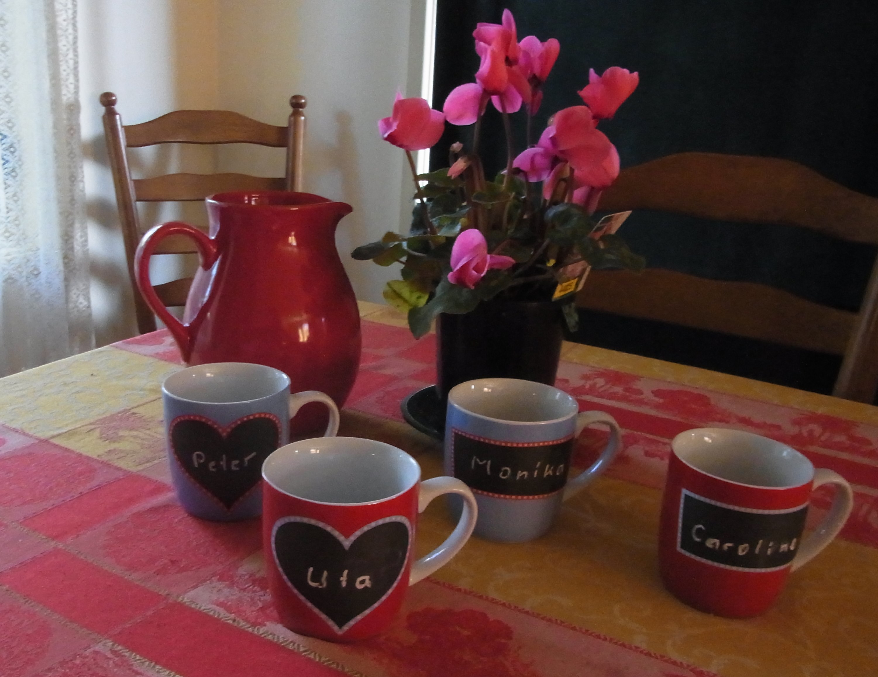 The black area on these cups serves as a chalkboard. The names can be written on the cups with a piece of chalk!