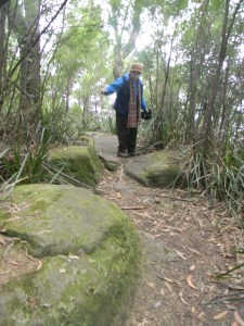 One of the tracks up there turned out to be a bit difficult for me. Peter frequently had to help me out along rocky steps. His strong hands gave me support. At one stage he drifted off a bit to take pictures of some wild flowers. I looked around. Suddenly I noticed a huge stick in the bush. It looked like some one had dropped it there for it didn’t seem to fit in the surroundings. I picked it up. It looked to me to be suitable as a walking stick, even though it was a bit long. It was easy to grab. I was very pleased with its very strong white wood. When Peter saw me with it, he wanted to take a picture straight away. Then he said he would like to put it on Facebook.